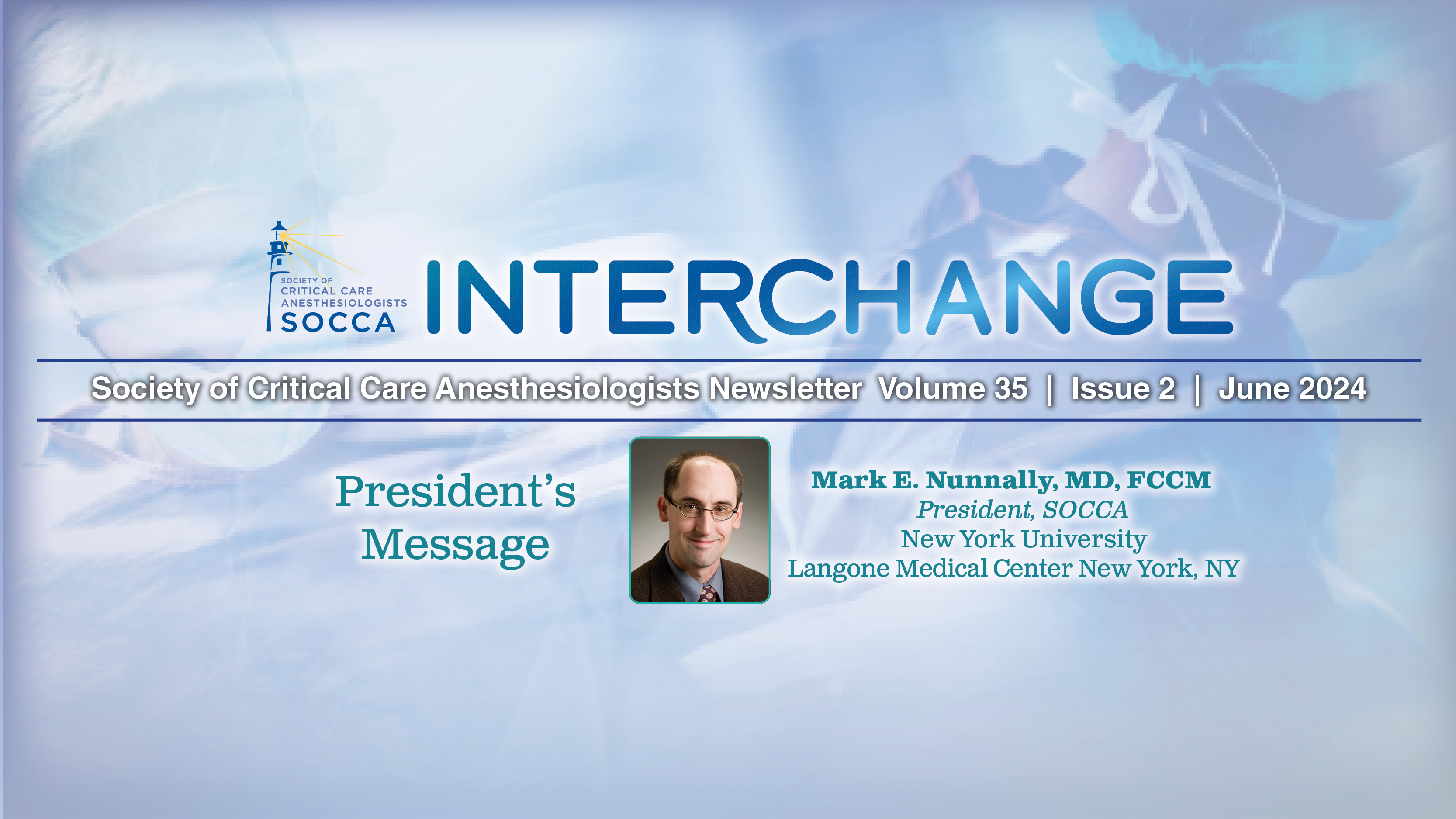 It was great to see so many of you at the 2024 Annual Meeting, presented by IARS and SOCCA, in my old hometown of Seattle. We presented what has to be the most extensive lineup of critical care content ever at a SOCCA meeting. Many thanks to Allison Dalton and Kunal Karamchandani for an excellent group of topics and speakers. Although the “feel” of the meeting is a little different, I hope you would agree the spirit is very much alive. IARS has been a gracious partner in supporting the meeting. The energy we bring to the meeting helps their own mission of education. We make a great partnership!